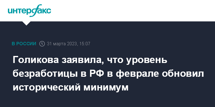Голикова заявила, что уровень безработицы в РФ в феврале обновил исторический минимум