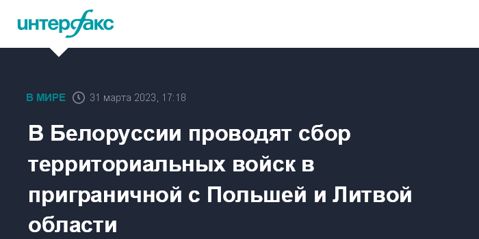 Москва. 31 марта. INTERFAX.RU - В Белоруссии проходит сбор территориальных войск в приграничной с Польшей и Литвой Гродненской области Белоруссии, сообщила пресс-служба белорусского Минобороны.