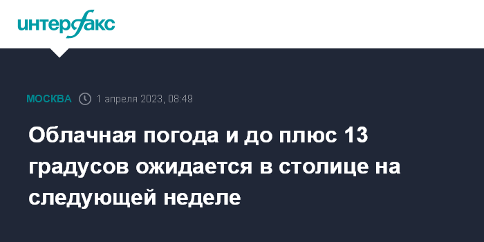 Москва. 1 апреля. INTERFAX.RU - Облачная погода с небольшими осадками и температурой до плюс 13 градусов прогнозируется в Москве на следующей неделе, сообщил "Интерфаксу" научный руководитель Гидрометцентра России Роман Вильфанд.