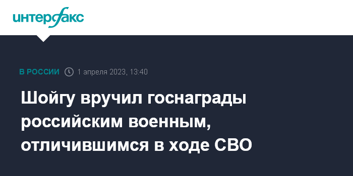 Москва. 1 апреля. INTERFAX.RU - Министр обороны РФ Сергей Шойгу вручил военнослужащим медали "Золотая Звезда" и другие государственные награды в штабе объединенной группировки российских войск, задействованных в специальной военной операции (СВО) на Украине, сообщили в Минобороны РФ в субботу.