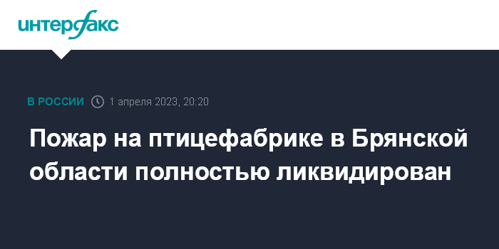 Москва. 1 апреля. INTERFAX.RU - Спасатели полностью потушили пожар на птицефабрике в селе Уручье Брянской области, сообщает ГУ МЧС по региону.