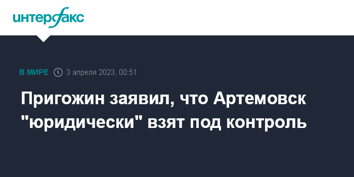 Москва. 3 апреля. INTERFAX.RU - Руководитель "Вагнера" Евгений Пригожин сообщил, что подразделения группы взяли под контроль городскую администрацию Артемовска (Бахмута) в Донецкой народной республике.