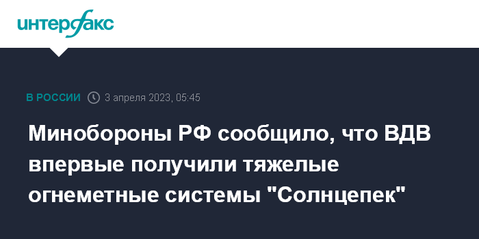 Москва. 3 апреля. INTERFAX.RU - В министерстве обороны РФ заявили, что подразделения Воздушно-десантных войск (ВДВ), которые направляют в зону специальной военной операции (СВО) на Украине, усиливают тяжелыми огнеметными системами "Солнцепек".