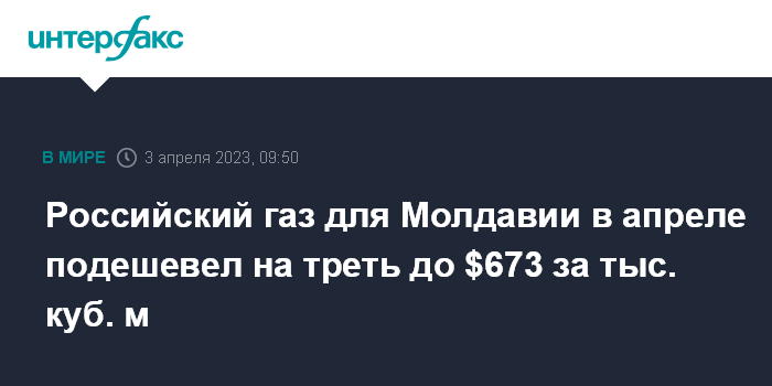 Москва. 3 апреля. INTERFAX.RU - Закупочная стоимость российского газа для Молдавии в апреле составит $673 за 1 тыс. кубометров. Об этом сообщил председатель правления "Молдовагаз" Вадим Чебан в своем телеграм-канале.