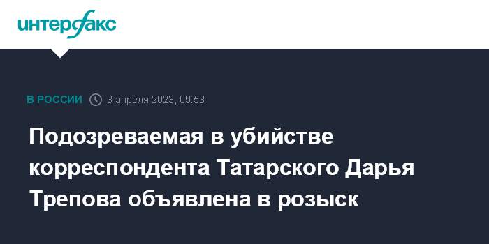 Москва. 3 апреля. INTERFAX.RU - МВД России объявило в розыск Дарью Трепову, подозреваемую в убийстве военного корреспондента Владлена Татарского в кафе Санкт-Петербурга.