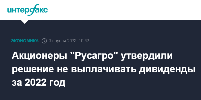 Москва. 3 апреля. INTERFAX.RU - Акционеры ГК "Русагро" на годовом собрании утвердили решение совета директоров не выплачивать дивиденды по итогам 2022 года, сообщает компания.