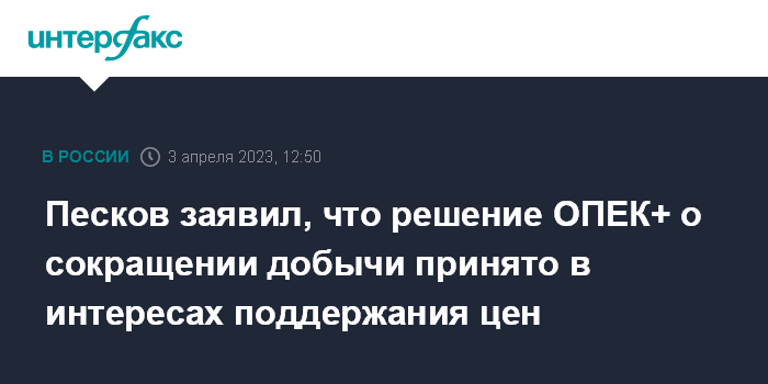Песков заявил, что решение ОПЕК+ о сокращении добычи принято в интересах поддержания цен