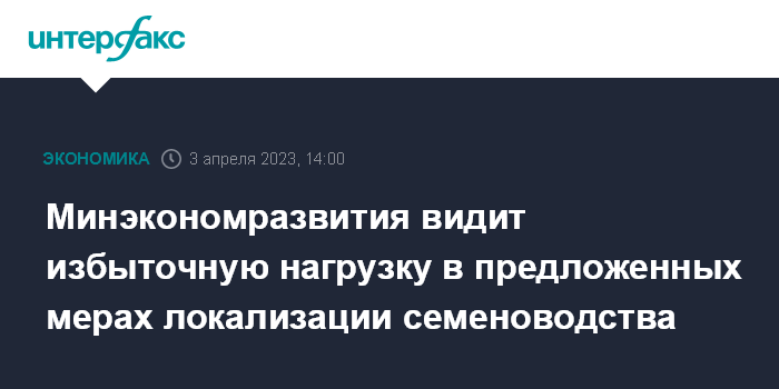 Москва. 3 апреля. INTERFAX.RU - Минэкономразвития видит избыточную нагрузку на бизнес в предложенных Минсельхозом путях локализации производства семян в России, а также считает, что выдвинутые решения не обоснованы.