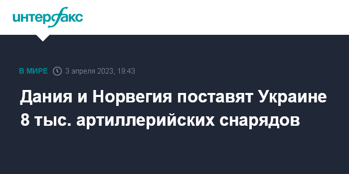 Москва. 3 апреля. INTERFAX.RU - Дания и Норвегия договорились совместными усилиями поставить Украине 8 тыс. артиллерийских снарядов, сообщает в понедельник Bloomberg со ссылкой на датское Минобороны.