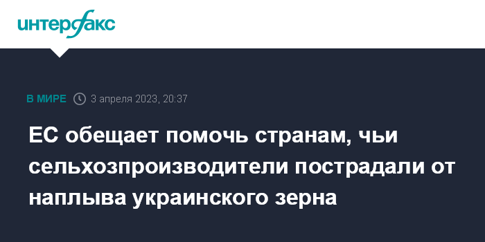 Москва. 3 апреля. INTERFAX.RU - Еврокомиссия стремится помочь населению Украины за счет организации экспорта украинского зерна, однако следит за тем, чтобы рынок ЕС при этом не получил слишком сильный удар от мер поддержки Киева, заявил официальный представитель ЕК Балаш Уйвари.