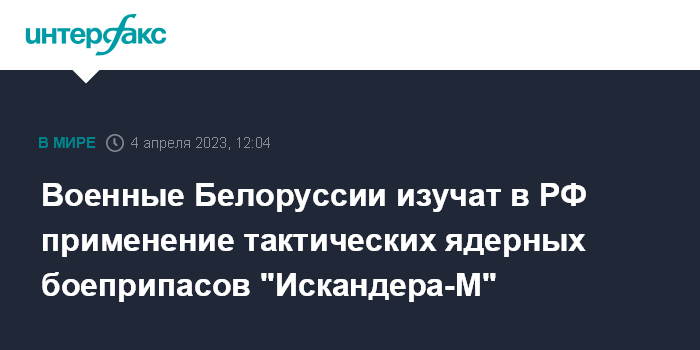 Москва. 4 апреля. INTERFAX.RU - Белорусские расчеты оперативно-тактического комплекса "Искандер-М" направлены на подготовку в Россию, в частности, им предстоит изучить вопросы содержания и применения тактических ядерных боеприпасов, сообщила пресс-служба Минобороны РБ во вторник.