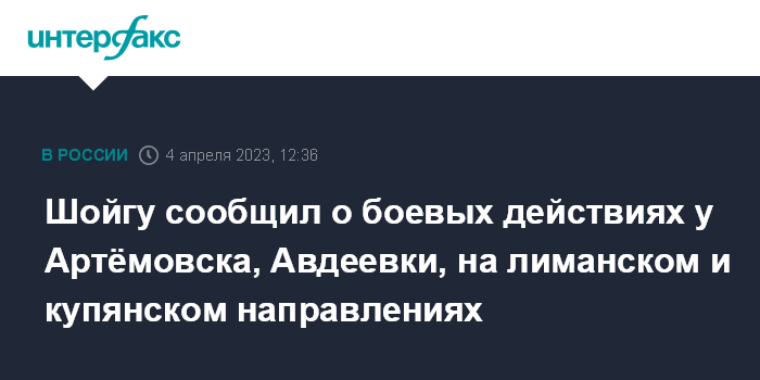 Москва. 4 апреля. INTERFAX.RU - Министр обороны РФ Сергей Шойгу заявил, что боевые действия в районе Артемовска (Бахмут) и на других направлениях развиваются планомерно.