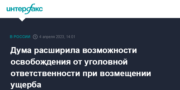 Москва. 4 апреля. INTERFAX.RU - Госдума приняла в третьем чтении закон о расширении перечня лиц, совершивших преступления, на которые распространяется возможность освобождения от уголовной ответственности в связи с возмещением ущерба.