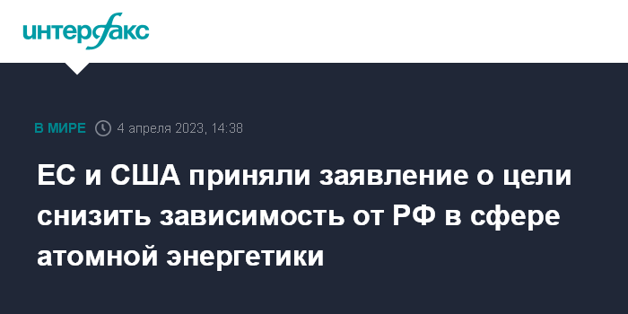 Москва. 4 апреля. INTERFAX.RU - США и ЕС намерены усилить сотрудничество в сфере ядерных материалов для снижения зависимости от РФ и поддерживают усилия по диверсификации поставок, говорится в совместном заявлении, опубликованном по итогам десятого совета по энергетике США-ЕС.