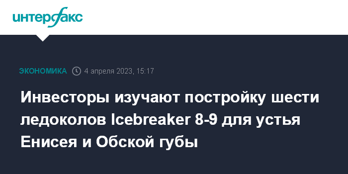 Москва. 4 апреля. INTERFAX.RU - Инвесторы изучают строительство шести ледоколов класса Icebreaker 8-9 для работы в устье реки Енисей и Обской губе. Об этом сообщается в статье вице-премьер Александра Новака, посвященной развитию Северного морского пути (СМП), подготовленной для апрельского номера журнала "Энергетическая политика".