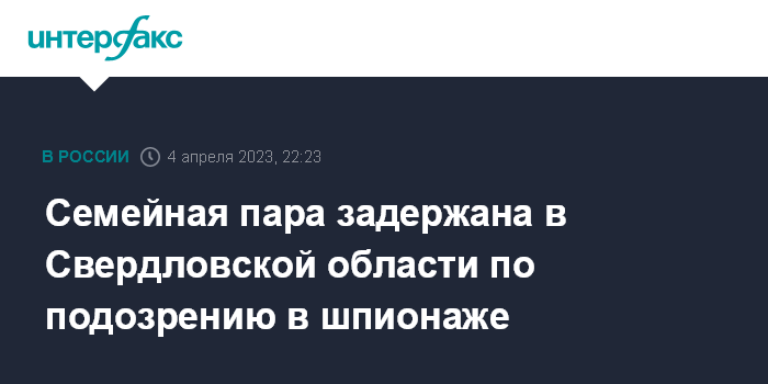 Москва. 4 апреля. INTERFAX.RU - Управление ФСБ по Свердловской области сообщило о задержании супружеской пары, подозреваемой в шпионаже в отношении оборонно-промышленного предприятия.