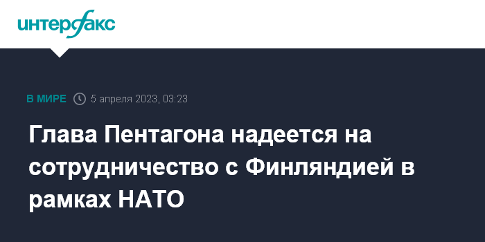 Москва. 5 апреля. INTERFAX.RU - Глава Пентагона Ллойд Остин надеется на активное сотрудничество в рамках НАТО с Финляндией, вступившей в альянс накануне, а также на скорейшее вступление в НАТО Швеции, заявил Пентагон.