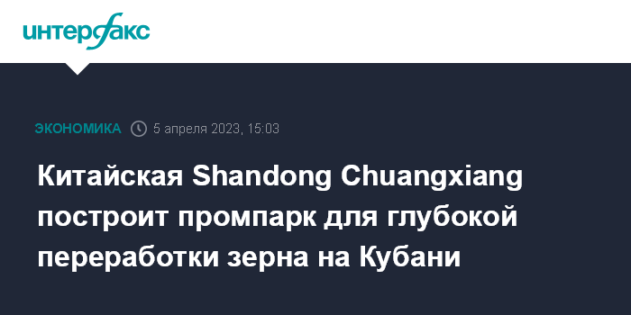 Москва. 5 апреля. INTERFAX.RU - Китайская Shandong Chuangxiang Group Co.,Ltd планирует построить в Краснодарском крае промпарк для глубокой переработки зерна, сообщила торгово-промышленная палата региона.