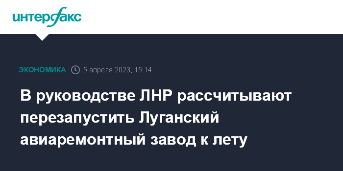 Москва. 5 апреля. INTERFAX.RU - Врио главы Луганской народной республики Леонид Пасечник сообщил в соцсетях о планах к лету возобновить выпуск продукции на Луганском авиаремонтном заводе, который простаивает с 2014 года.