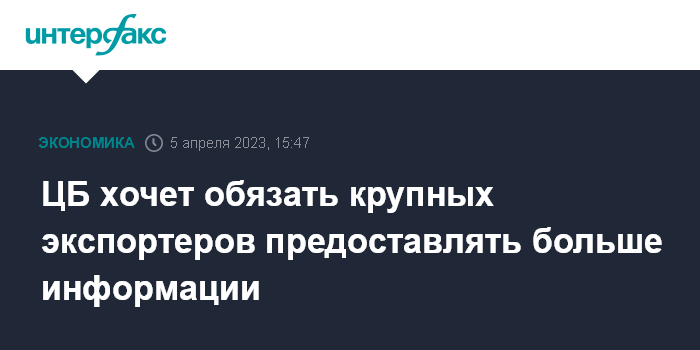 Москва. 5 апреля. INTERFAX.RU - Банк России хочет получать от крупнейших экспортеров больше информации о валютной выручке, активах и обязательствах в валюте, чтобы лучше контролировать финансовые потоки.