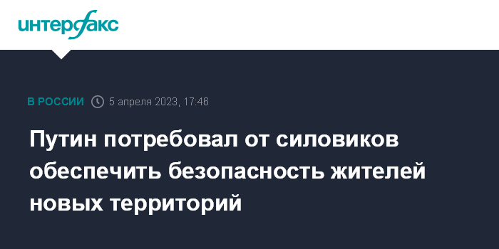 Москва. 5 апреля. INTERFAX.RU - Президент Владимир Путин поручил силовым ведомствам обеспечить защиту граждан и предпринимателей новых территорий от преступности, произвола и насилия. Он заявил об этом на заседании Совета безопасности.