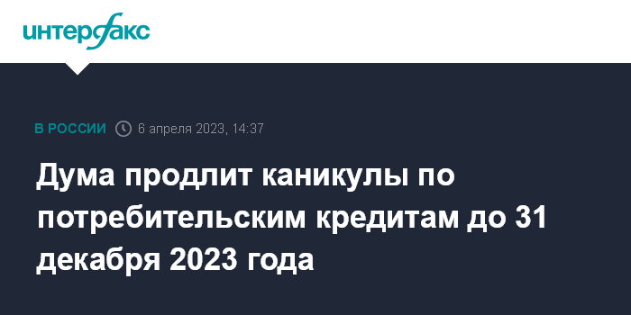 Москва. 6 апреля. INTERFAX.RU - Госдума приняла во втором чтении законопроект, который продлевает до 31 декабря 2023 года период, в течении которого граждане и ряд представителей малого и среднего бизнеса могут обратиться в банки за предоставлением каникул по потребительским кредитам.