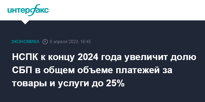 Москва. 6 апреля. INTERFAX.RU - Национальная система платежных карт (НСПК) планирует к концу 2024 года увеличить долю Системы быстрых платежей (СБП) в общем объеме расчетов за товары и услуги с 6,4% до 25%. Эта задача указана в стратегии развития НСПК на 2023-2024 годы.