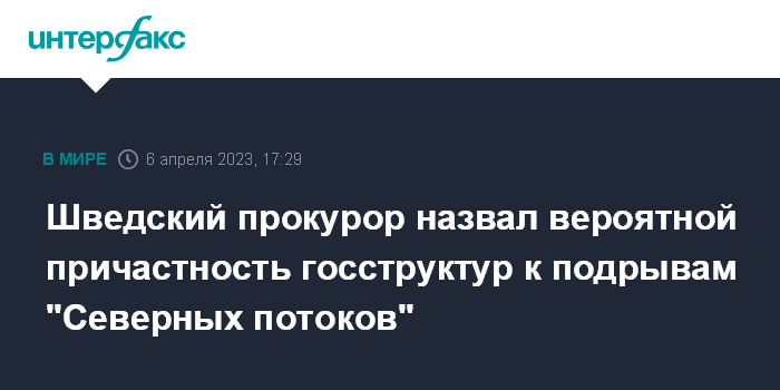 Москва. 6 апреля. INTERFAX.RU - Шведский прокурор Матс Люнгквист считает наиболее вероятным, что за подрывами "Северных потоков" в Балтике стояла организация, связанная с госструктурами, передает АР со ссылкой на официальное заявление офиса этого прокурора, который руководит расследованием этой диверсии.