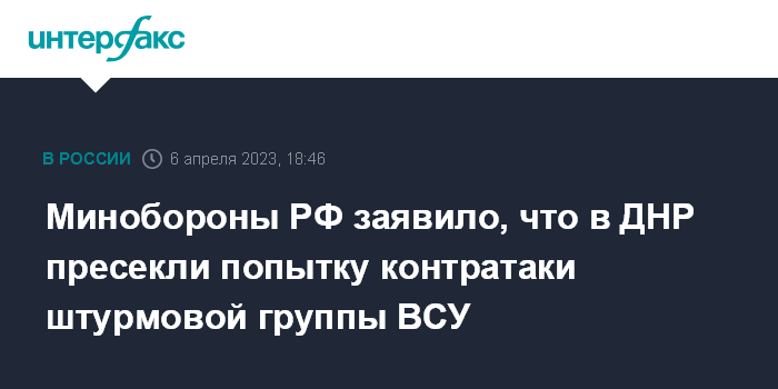 Москва. 6 апреля. INTERFAX.RU - Российские военные пресекли попытку штурмовой группы Вооруженных сил Украины (ВСУ) контратаковать в направлении населенных пунктов Водяное и Никольское в ДНР, заявил официальный представитель Минобороны РФ Игорь Конашенков на брифинге в четверг.