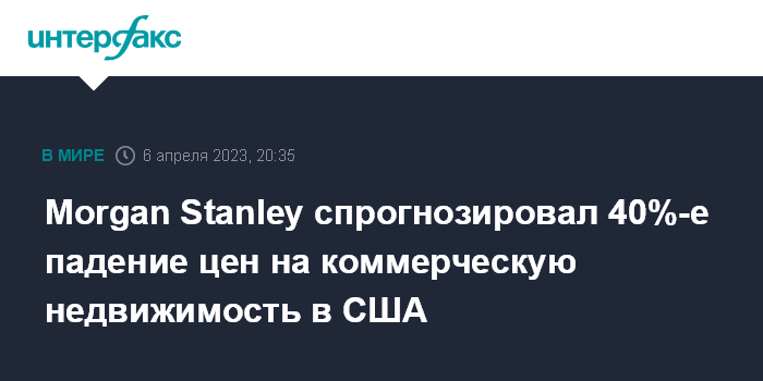 Москва. 6 апреля. INTERFAX.RU - Цены на коммерческую недвижимость в США могут упасть на 40%. Это прогнозируют эксперты Morgan Stanley Wealth Management.