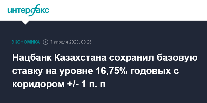 Москва. 7 апреля. INTERFAX.RU - Комитет по денежно-кредитной политике Национального Банка Казахстана принял решение сохранить базовую ставку на уровне 16,75% годовых с коридором +/- 1 п.п., сообщила пресс-служба регулятора.