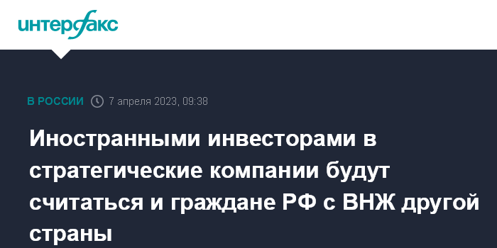 Иностранными инвесторами в стратегические компании будут считаться и граждане РФ с ВНЖ другой страны