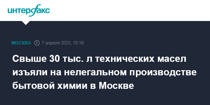 Москва. 7 апреля. INTERFAX.RU - Сотрудники МВД раскрыли незаконное производство бытовой химии и моторного масла на северо-востоке Москвы и задержали пять человек, сообщила официальный представитель МВД России Ирина Волк.