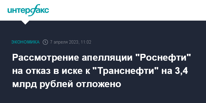 Рассмотрение апелляции "Роснефти" на отказ в иске к "Транснефти" на 3,4 млрд рублей отложено