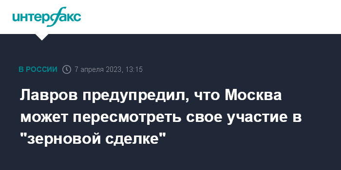 Москва. 7 апреля. INTERFAX.RU - В случае невыполнения условий "зерновой" сделки в Москве будут думать о том, как действовать в других форматах, заявил глава МИД РФ Сергей Лавров.