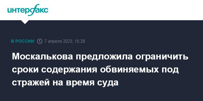 Москва. 7 апреля. INTERFAX.RU - Для обвиняемых следует установить конечные сроки содержания под стражей на время судебного процесса, заявила в пятницу уполномоченная по правам человека в РФ Татьяна Москалькова.