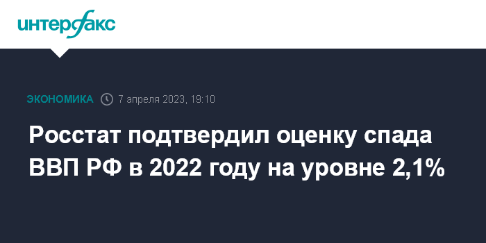 Москва. 7 апреля. INTERFAX.RU - Росстат подтвердил предварительную оценку снижения ВВП РФ в 2022 году на уровне 2,1%. Об этом говорится в пятничном сообщении статслужбы.
