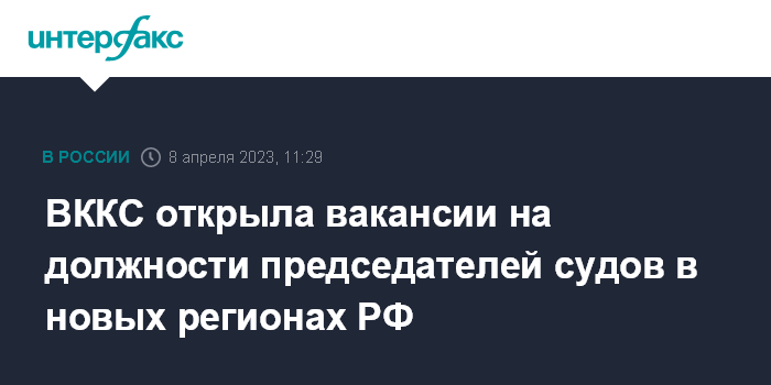 Москва. 8 апреля. INTERFAX.RU - Высшая квалификационная коллегия судей РФ официально объявила об открытии вакантных должностей председателей судов на территории ДНР, ЛНР, Запорожской и Херсонской областей.