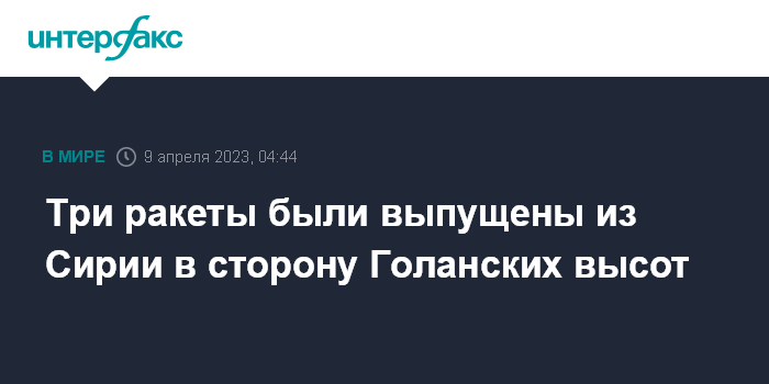 Москва. 9 апреля. INTERFAX.RU - По меньшей мере три ракеты были выпущены в сторону Голанских высот с территории Сирии рано утром в воскресенье, сообщает газета The Jerusalem Post со ссылкой на пресс-службу израильской армии.