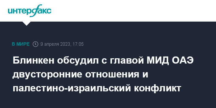 Москва. 9 апреля. INTERFAX.RU - Госсекретарь США Энтони Блинкен провел телефонный разговор с министром иностранных дел ОАЭ шейхом Абдаллой бин Заидом Аль Нахайяном и обсудил с ним темы двустороннего и международного характера, сообщает в воскресенье Госдеп.