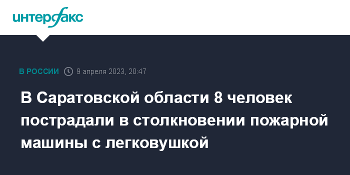 Москва. 9 апреля. INTERFAX.RU - Пожарный автомобиль столкнулся с легковушкой в саратовском поселке Духовницкое, сообщил глава Минздрава региона Олег Костин.