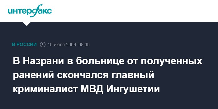 Москва. 9 июля. INTERFAX.RU – В Назрани в республиканской клинической больнице, не приходя в сознание, скончался главный эксперт-криминалист МВД Ингушетии Магомед Гадаборшев.