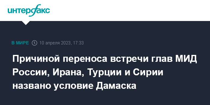 Москва. 10 апреля. INTERFAX.RU - Встреча глав МИД России, Ирана, Турции и Сирии перенесена из-за позиции Дамаска, который потребовал вывода турецких сил с сирийской территории как условия для его участия в переговорах с Анкарой, сообщают арабские СМИ со ссылкой на информированный источник.