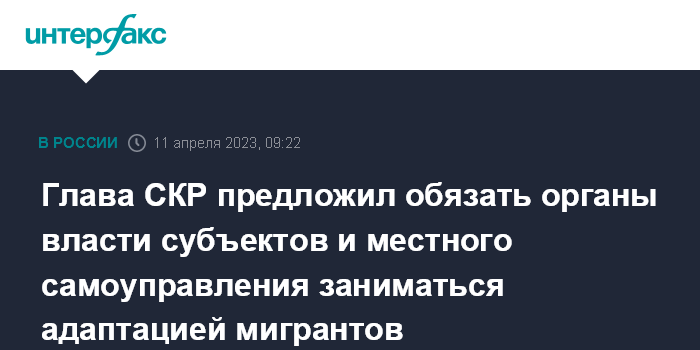 Москва. 11 апреля. INTERFAX.RU - Глава Следственного комитет России Александр Бастрыкин считает, что органы госвласти субъектов РФ и местного самоуправления должны принимать непосредственное участие в работе по адаптации мигрантов к жизни в стране.