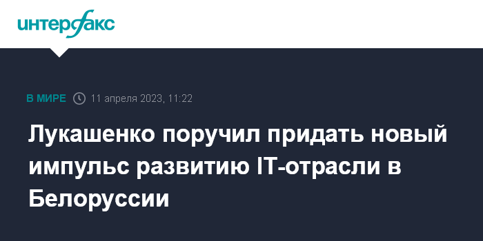 Москва. 11 апреля. INTERFAX.RU - Президент Белоруссии Александр Лукашенко поручил придать новый импульс развитию IT-сектора в республике, выйти на новые рынки и заместить западные инвестиции азиатскими. Его заявления, сделанные на совещании в Минске, приводит его пресс-служба.
