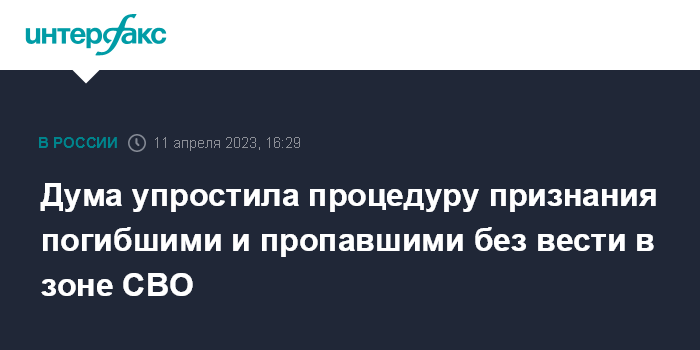 Москва. 11 апреля. INTERFAX.RU - Госдума приняла в третьем чтении законы об упрощении процедуры признания бойцов и гражданских лиц пропавшими без вести и погибшими в зоне СВО. Они должны вступить в силу через месяц после опубликования.