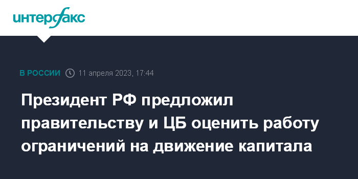 Москва. 11 апреля. INTERFAX.RU - Президент России Владимир Путин предложил правительству вместе с ЦБ РФ оценить работу сохраняющихся ограничений на движение капитала, их влияние на российскую экономику.
