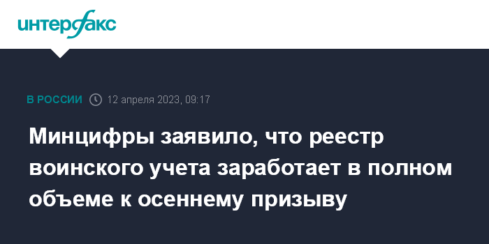 Москва. 11 апреля. INTERFAX.RU - Единый реестр военнообязанных граждан, который должен быть создан в соответствии с принятым Госдумой законом о цифровизации воинского учёта, в полном объеме заработает не ранее осеннего призыва на срочную службу, сообщил глава Минцифры Максут Шадаев.