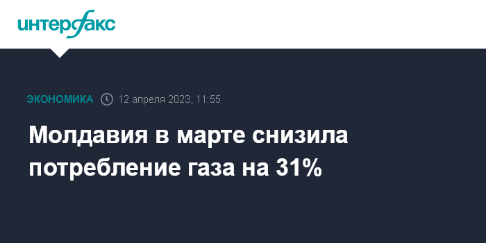 Москва. 12 апреля. INTERFAX.RU - В марте 2023 года потребление природного газа в Молдавии составило 64,7 млн кубометров, что на 31,1% меньше, чем в феврале 2023 года и на 56,7% - чем в марте 2022 года, сообщил председатель правления "Молдовагаза" Вадим Чебан в Telegram.