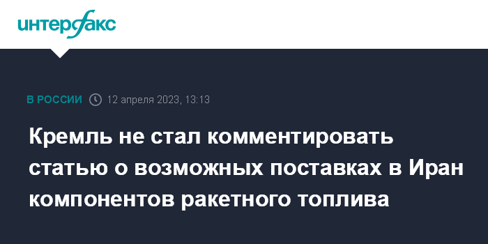 Москва. 12 апреля. INTERFAX.RU - Пресс-секретарь президента РФ Дмитрий Песков не стал комментировать публикацию о возможных переговорах Ирана с Россией и КНР по поставкам компонентов, необходимых для производства ракетного топлива.